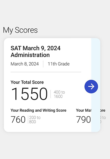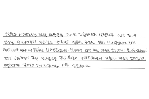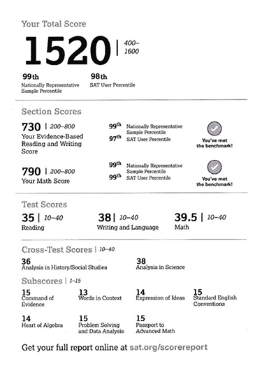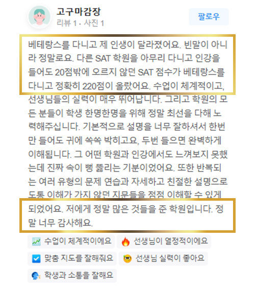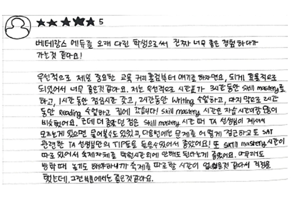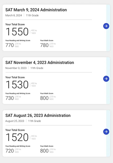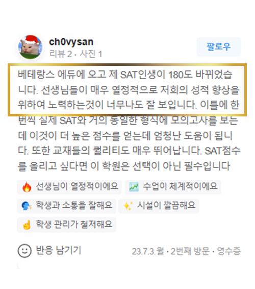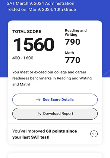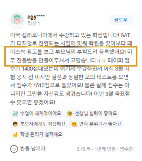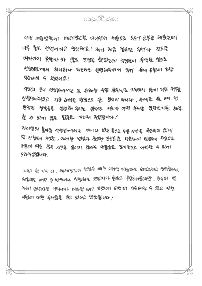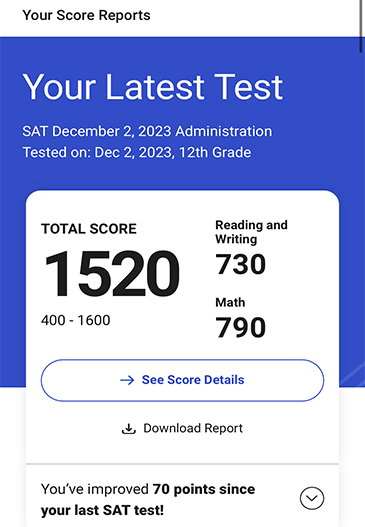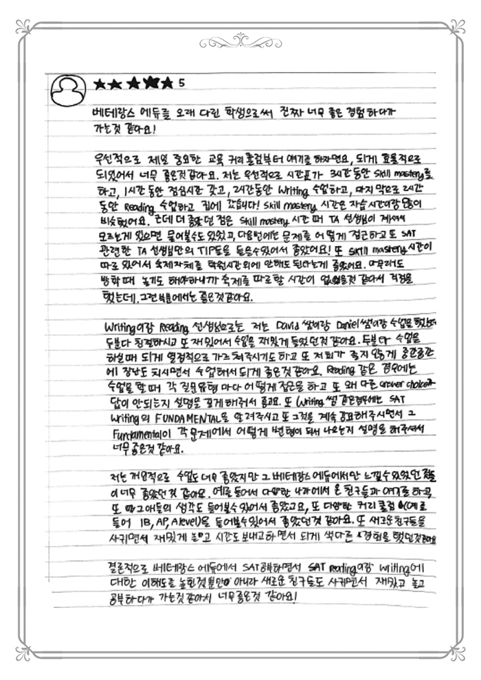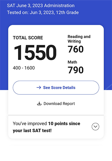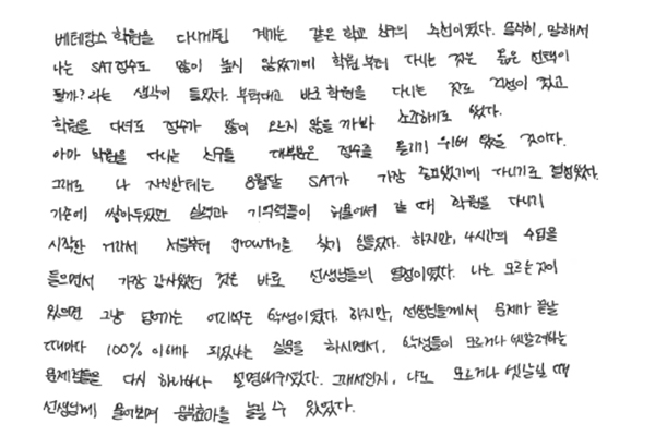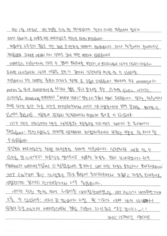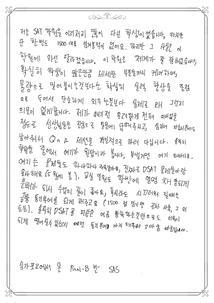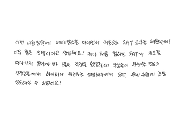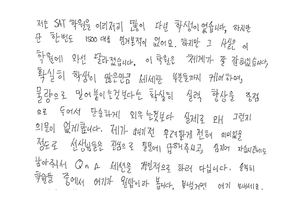 SAT 점수가 1400에서 1500 중반대로 1년 만에 올랐습니다.